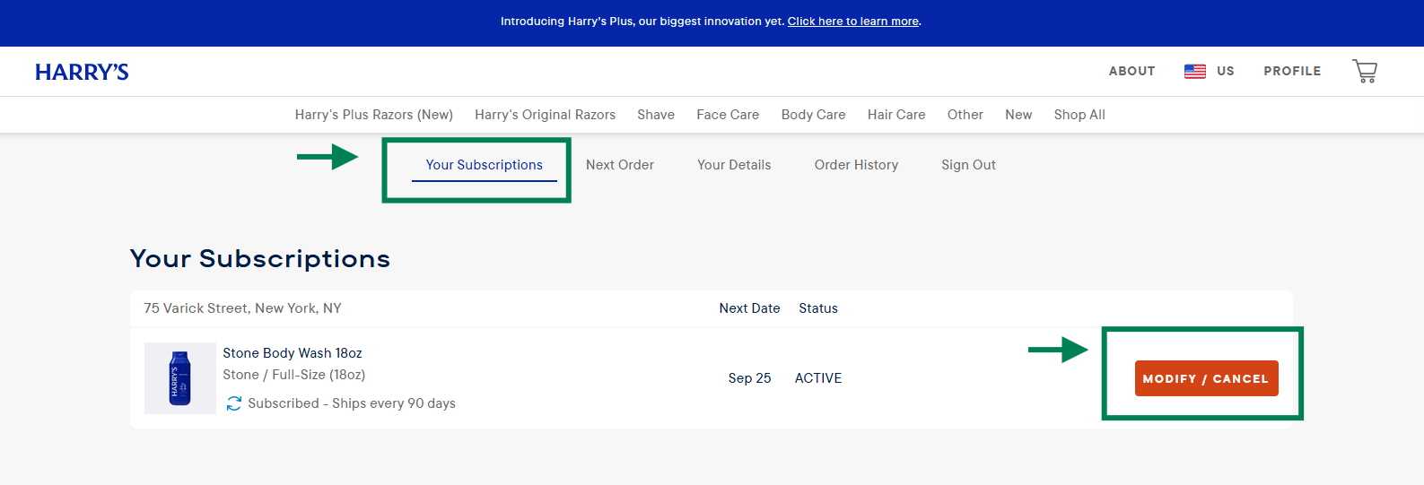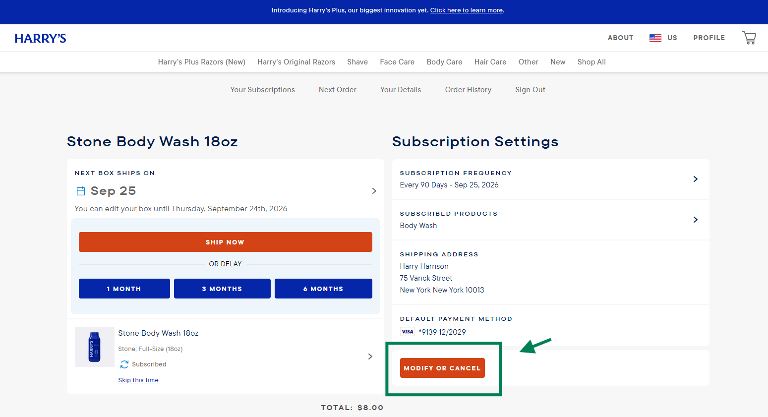 You’ll then be offered the options to delay, edit, or cancel your Subscription. To cancel, click “MODIFY OR CANCEL” under “Subscription Settings”: