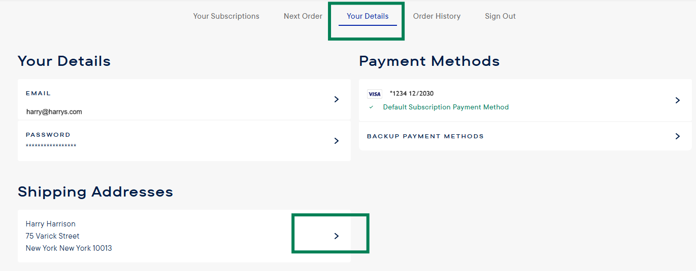 Click on “Your Details”. Then, click the arrow to the right of “Shipping Addresses”, and type in your preferred address.